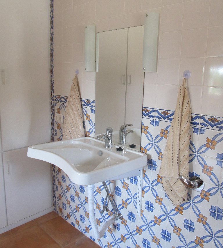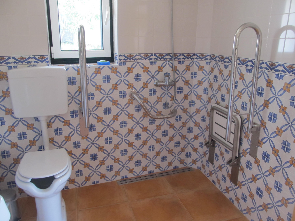 Das Badezimmer hat ein höhenverstellbares Waschbecken, ein barrierefreies WC / Bidet und Dusche. Die Haltegriffe und der Duschsitz ermöglichen dem bewegungseingeschränkten Gast Selbständigkeit bei der täglichen Hygiene.