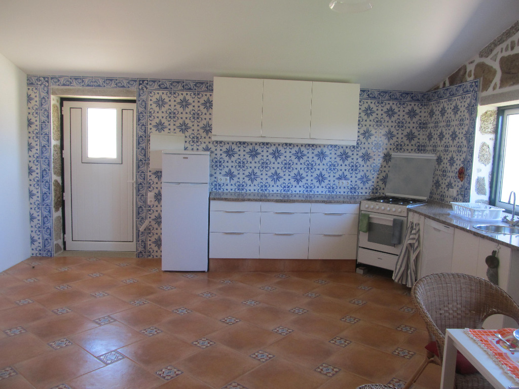 Die Küche ist komplett mit Herd, Backofen mit Grill, Geschirrspüler, Kühl- und Gefrierschrank, und elektrischen Kleingeräten ausgestattet, die Wände sind mit den typisch portugiesischen Wandfliesen dekoriert. Die Arbeitsplatte aus rosa Granit wurde von lokalen Handwerkern aus dem Nachbardorf angefertigt.